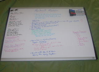 So, I’ve been trying to wrap my head around a new book idea and it’s right on the tip of my brain. So close, I can almost taste it. I know it’s there with action and excitement, but for some reason it’s just not coming. So being visual (have you noticed all the pictures on this blog) I took a clue from another blogger, thanks WriteBrained, and tried playing around yesterday with a dry ease board. Of course, I had to get multiple colored markers:) But in about an hour I went from this: