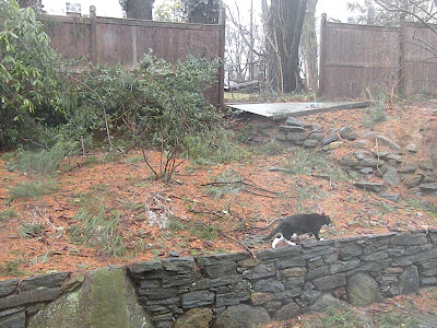 Then I woke on Sunday morning to a strange but cute cat walking though my yard and a piece of the back fence down along with another huge branch falling from a pine tree. DH had to buy a chainsaw. Yikes! Look out now!