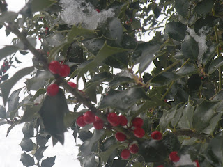 If we could just get a few days in a row above freezing and this darn snow would melt I’m sure I’d feel better. The word is it will get above freezing today then a steady drop back down after that. Oh well. At least the holly tree outside my bedroom window is pretty.